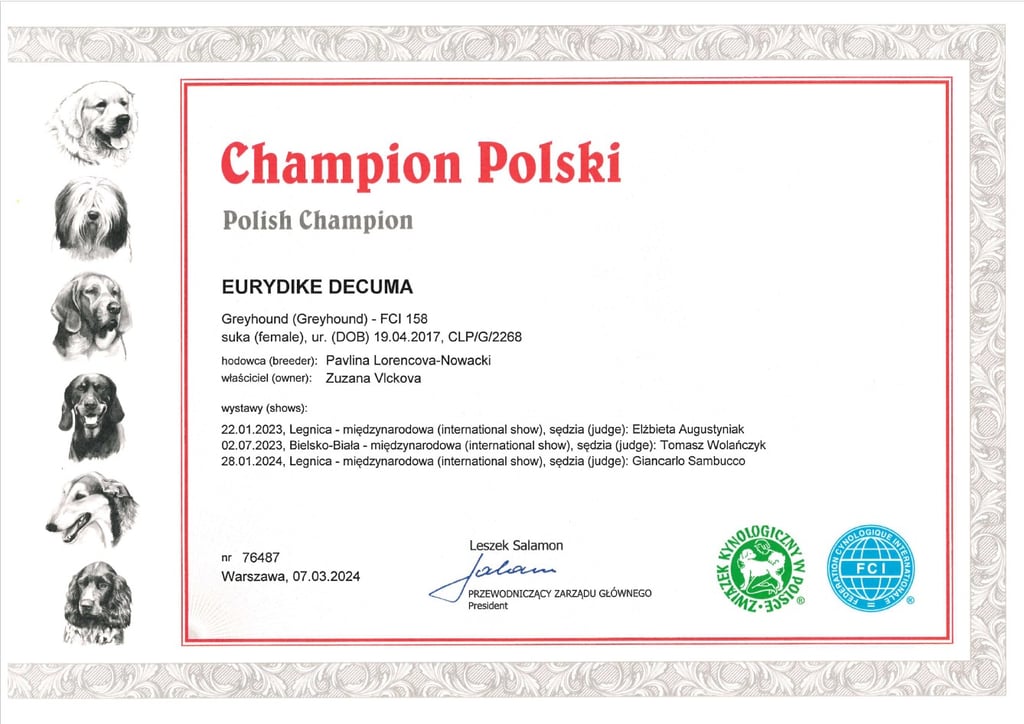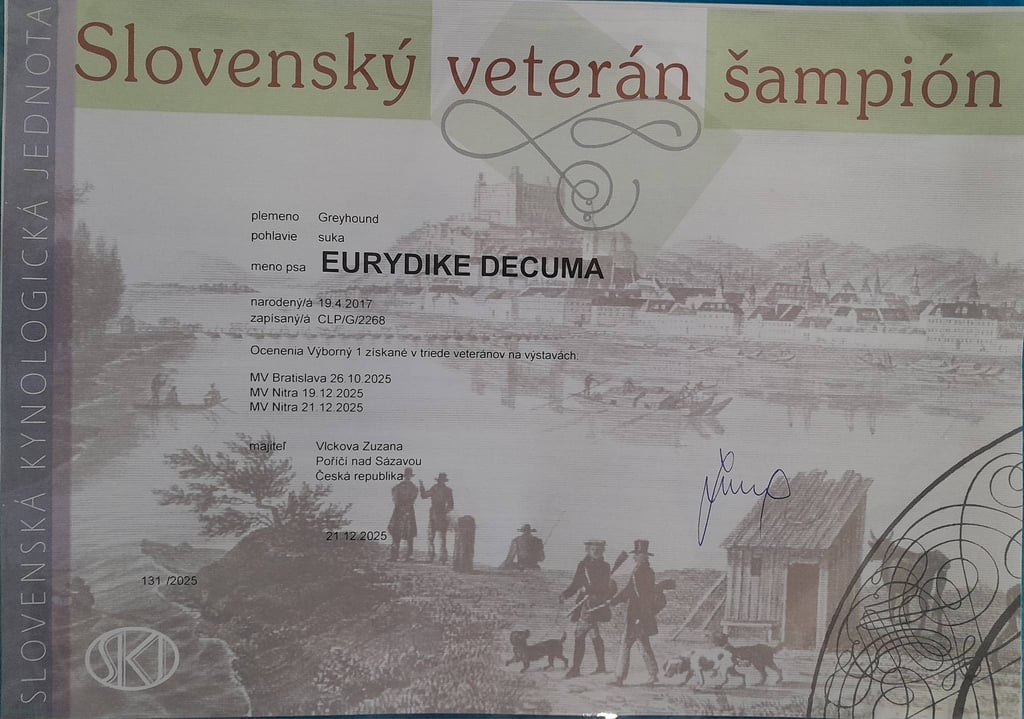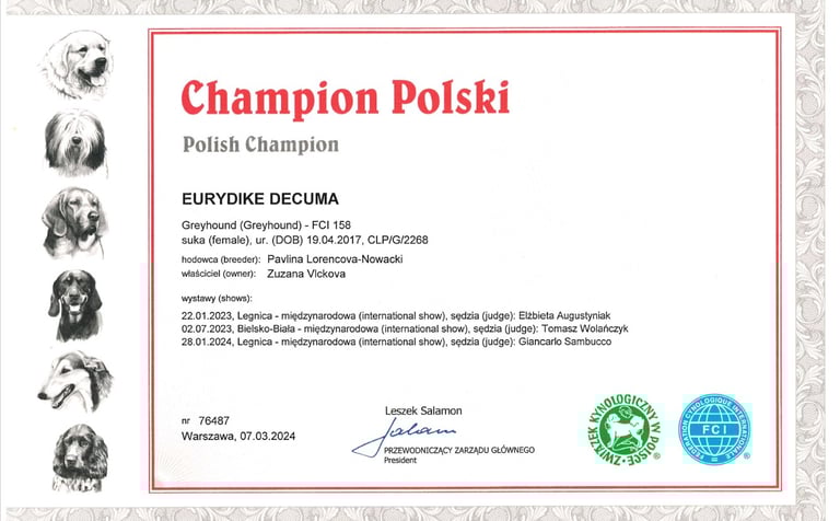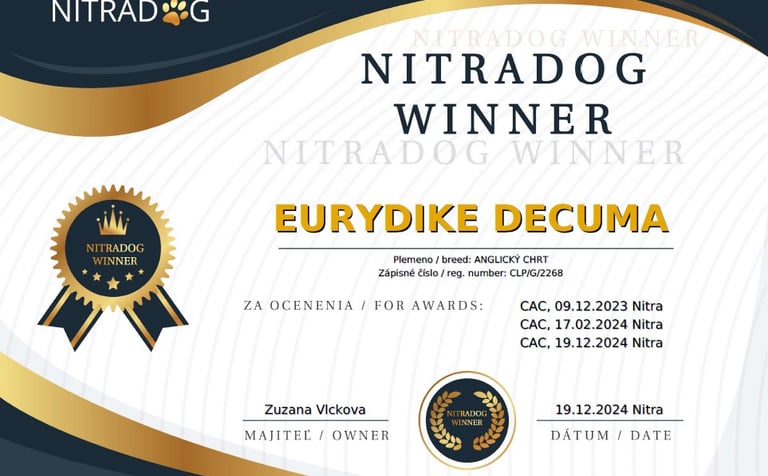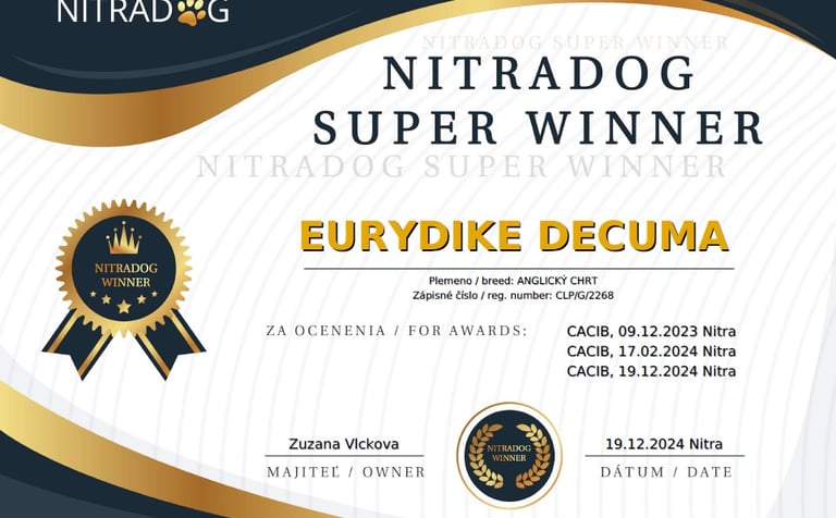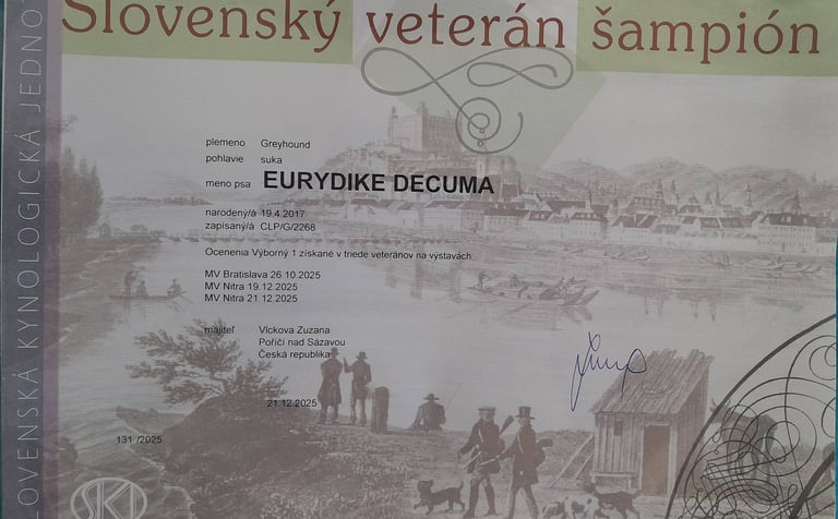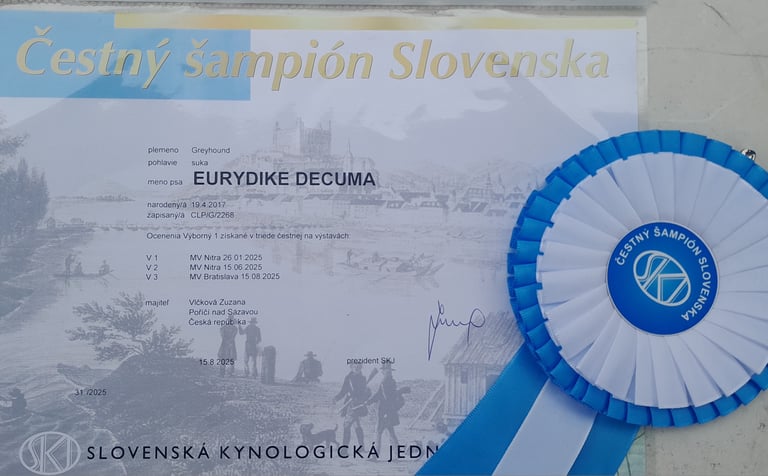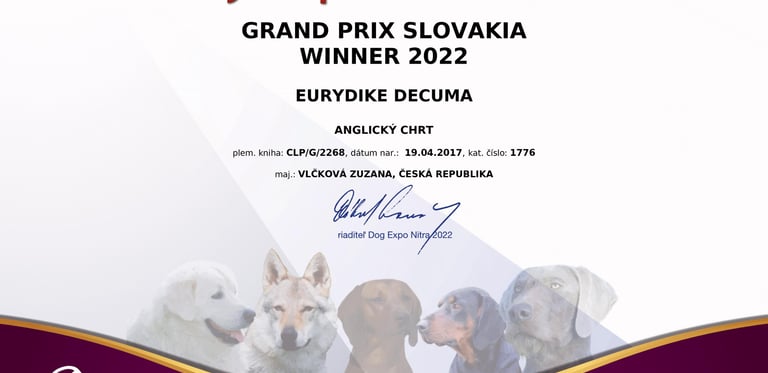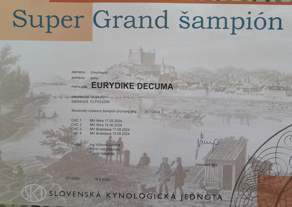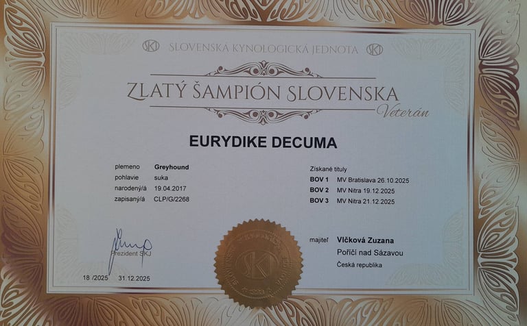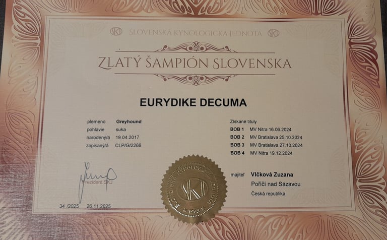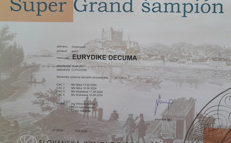 Mně a mým chrtíkům již od roku 2017 dělá společnost krásná, elegantní, něžná a milující greyhoundí holčička, která je naše ochránkyně, společnice, kamarádka a velká láska - naše úžasná Grace (Eurydike Decuma). Tato stránka je věnovaná jen a jen jí. Ona je splněný sen o "velkém chrtovi".
