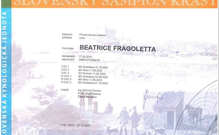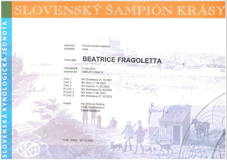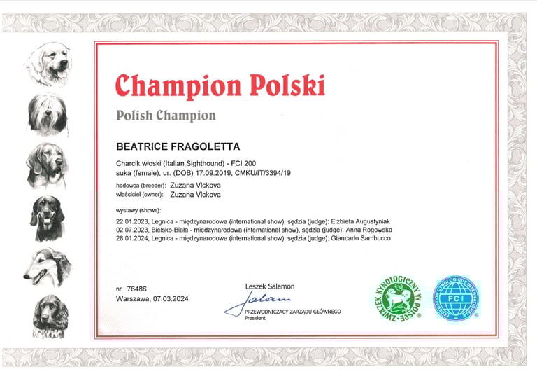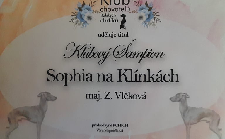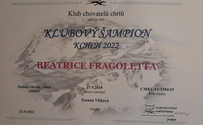 Dostihy: dostihový šampion Klubu chovatelu italských chrtíku, vítěz krása a výkon Untersiebenbrunn 2021 a 2022 (solo), šampion pro krásu a výkon Greppin 2018, šampion pro krásu a výkon Mladá Boleslav 2016, dostihová vicemistr Čech 2016, 1 x CACT, 2 x res. CACT, druhé místo na krása a výkon Kolín 2016 a Greppin 2016